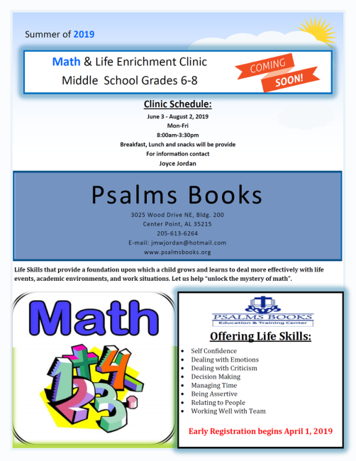 Our Math and Life Enrichment Summer Clinic will be greater than ever. We offer Math and Life Enrichment through classroom discussions, Arts, Crafts, Field Trips and much more. Enroll your child early. Looking forward to hearing from you soon.
